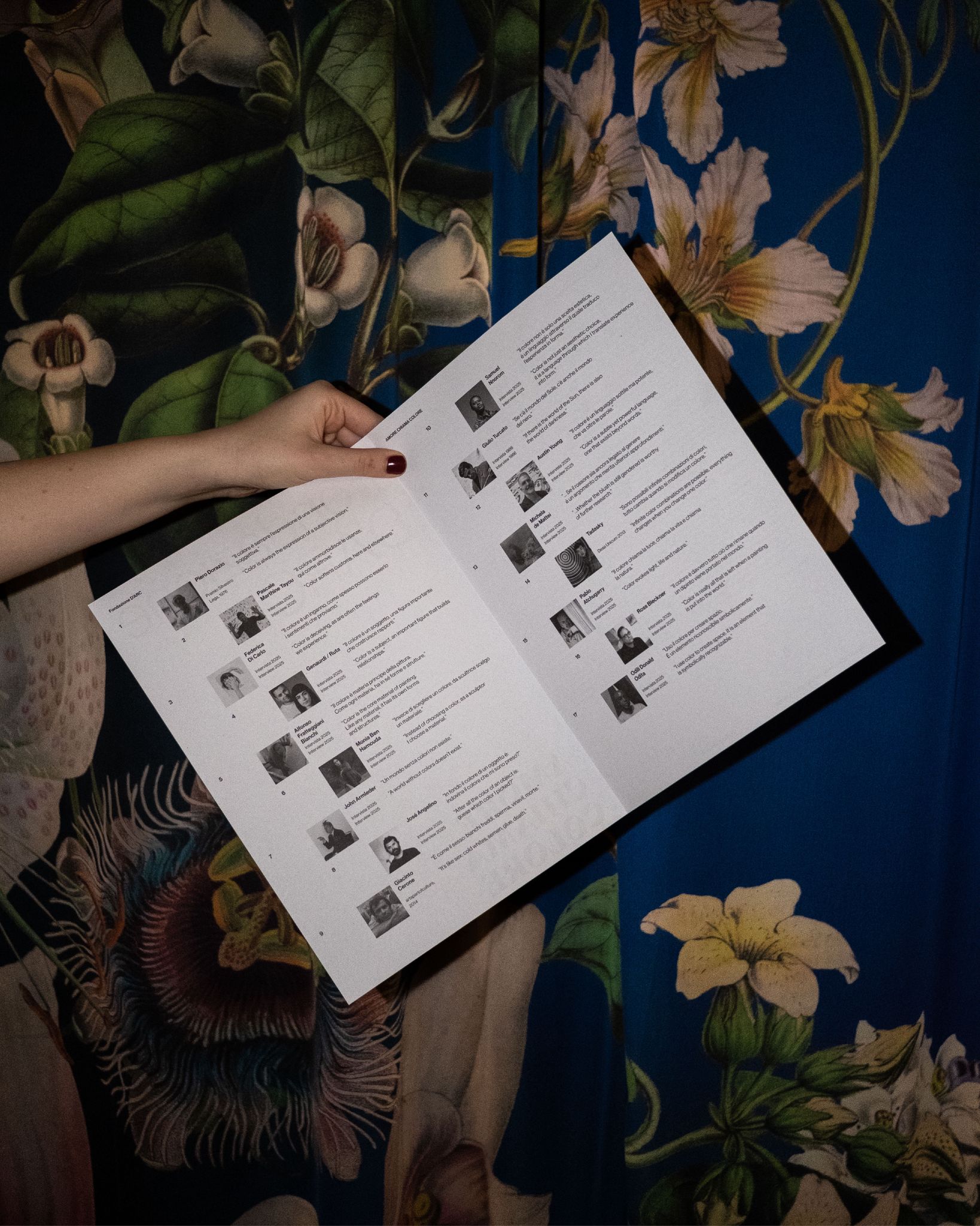 Il testo di mostra è pensato come una partitura temporale. La sua struttura grafica si ispira a un’estetica archivistica contaminata dalla forma dello script cinematografico: un impianto rigoroso, quasi notarile, in cui la disposizione tipografica e la scansione delle date dell’intervista interrompono la linearità della lettura, trasformando la pagina in una sequenza. Le date non sono meri riferimenti cronologici, ma coordinate che attivano una dimensione di montaggio, evocando tanto la sedimentazione dell’archivio quanto il ritmo del linguaggio filmico.