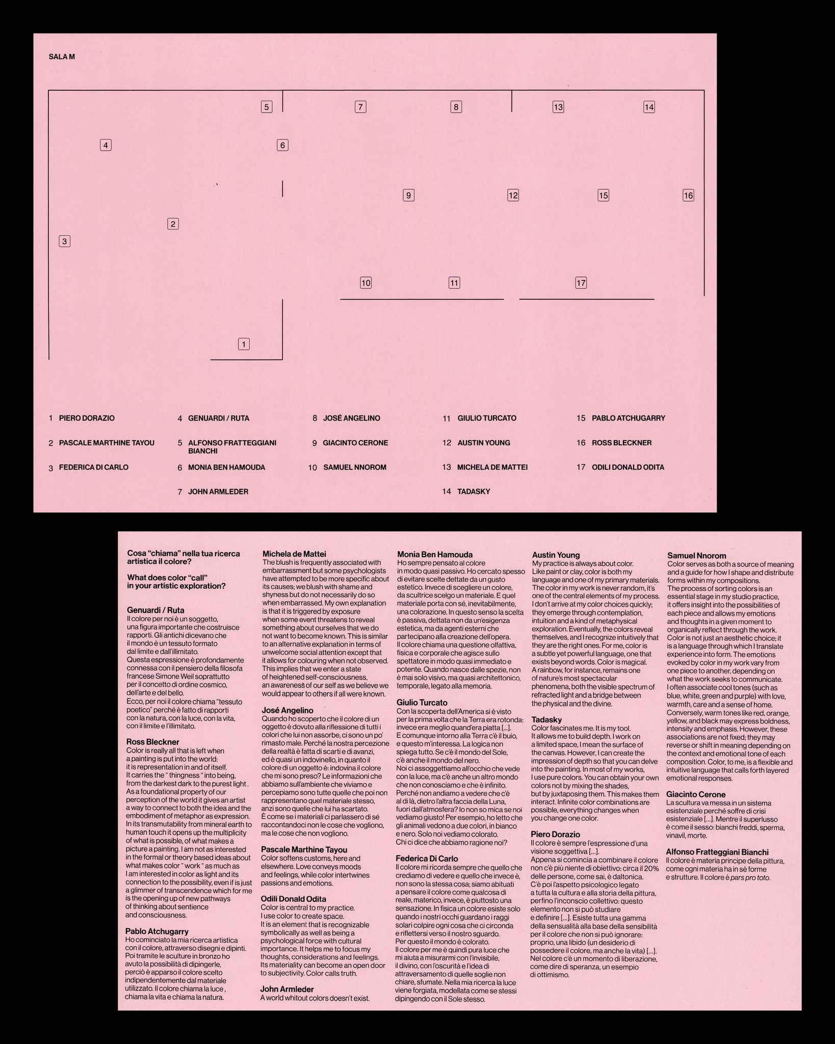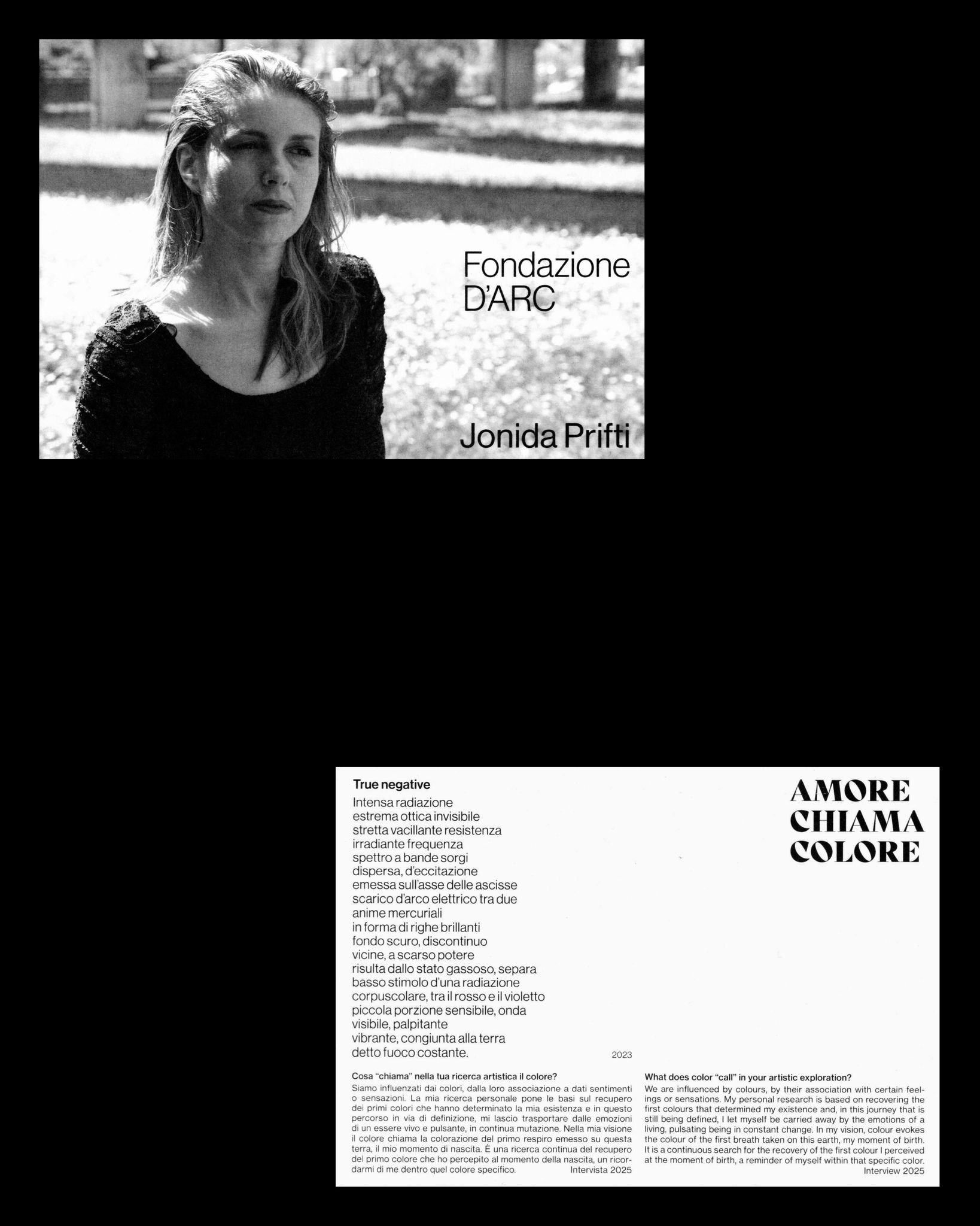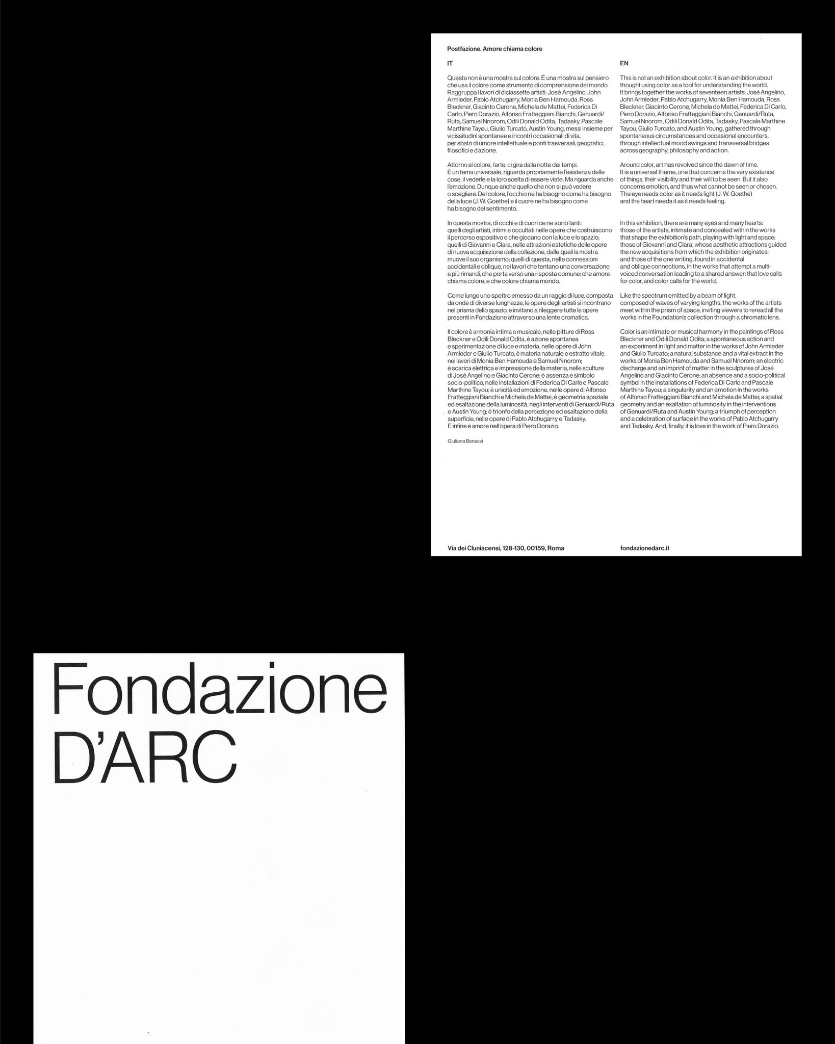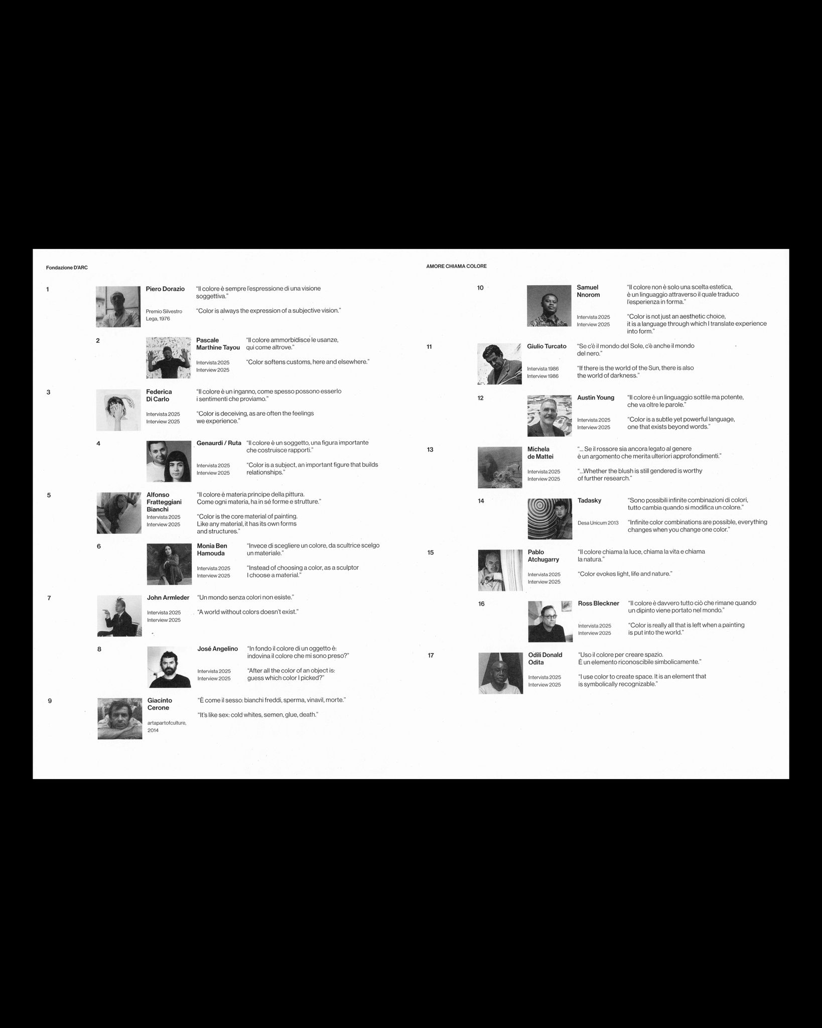 L’intero progetto si fonda su questi principi: l’essenzialità come scelta consapevole, la riduzione come strumento per far emergere il significato, la griglia come architettura invisibile che sostiene il messaggio. Il risultato è un linguaggio visivo che riflette un dialogo tra emozione e ordine, tra il concetto di “colore” e la sua reinterpretazione attraverso la purezza del bianco e nero, impreziosito da un intervento cromatico calibrato che valorizza gli spazi, i rapporti e il ritmo interno delle pagine.
