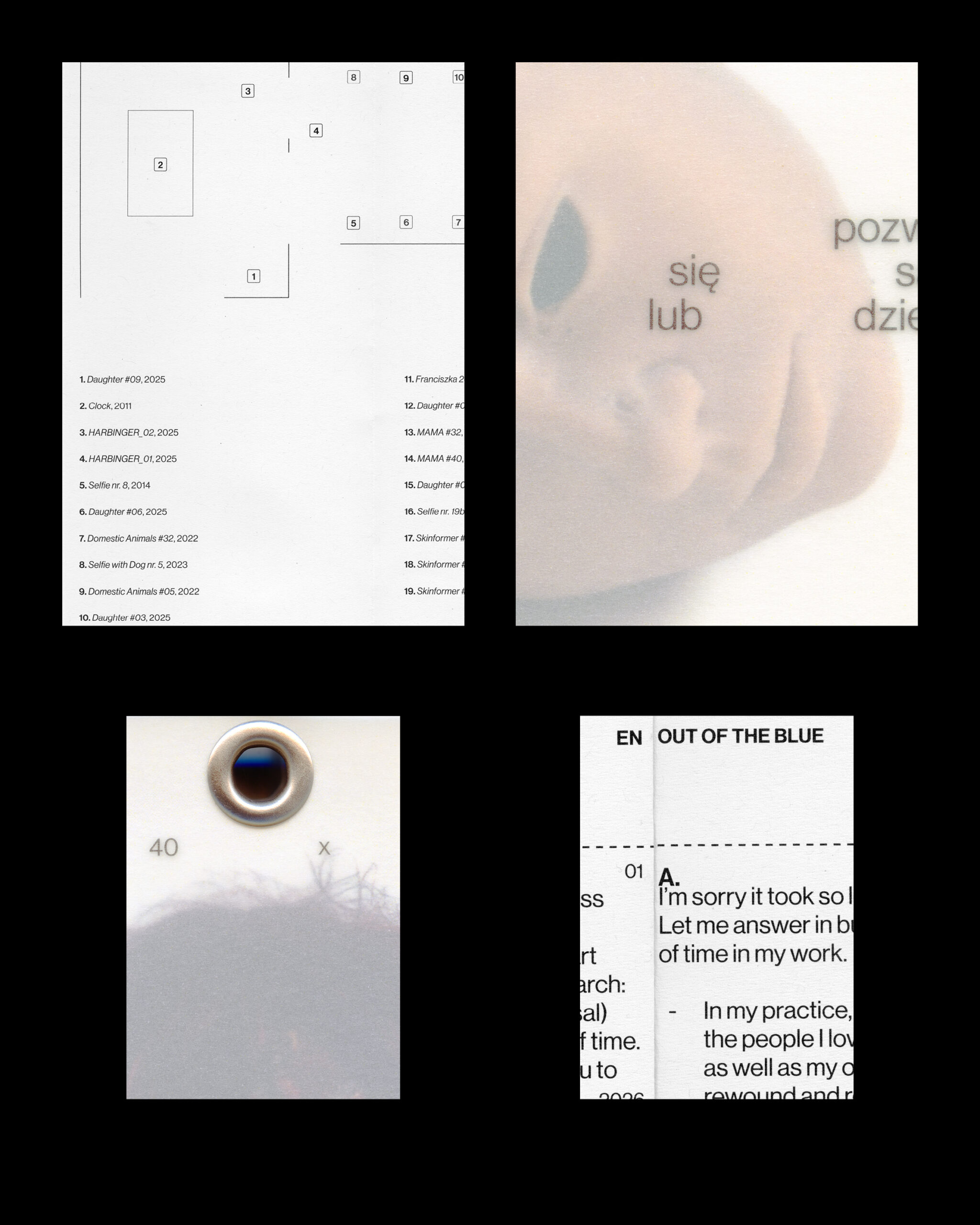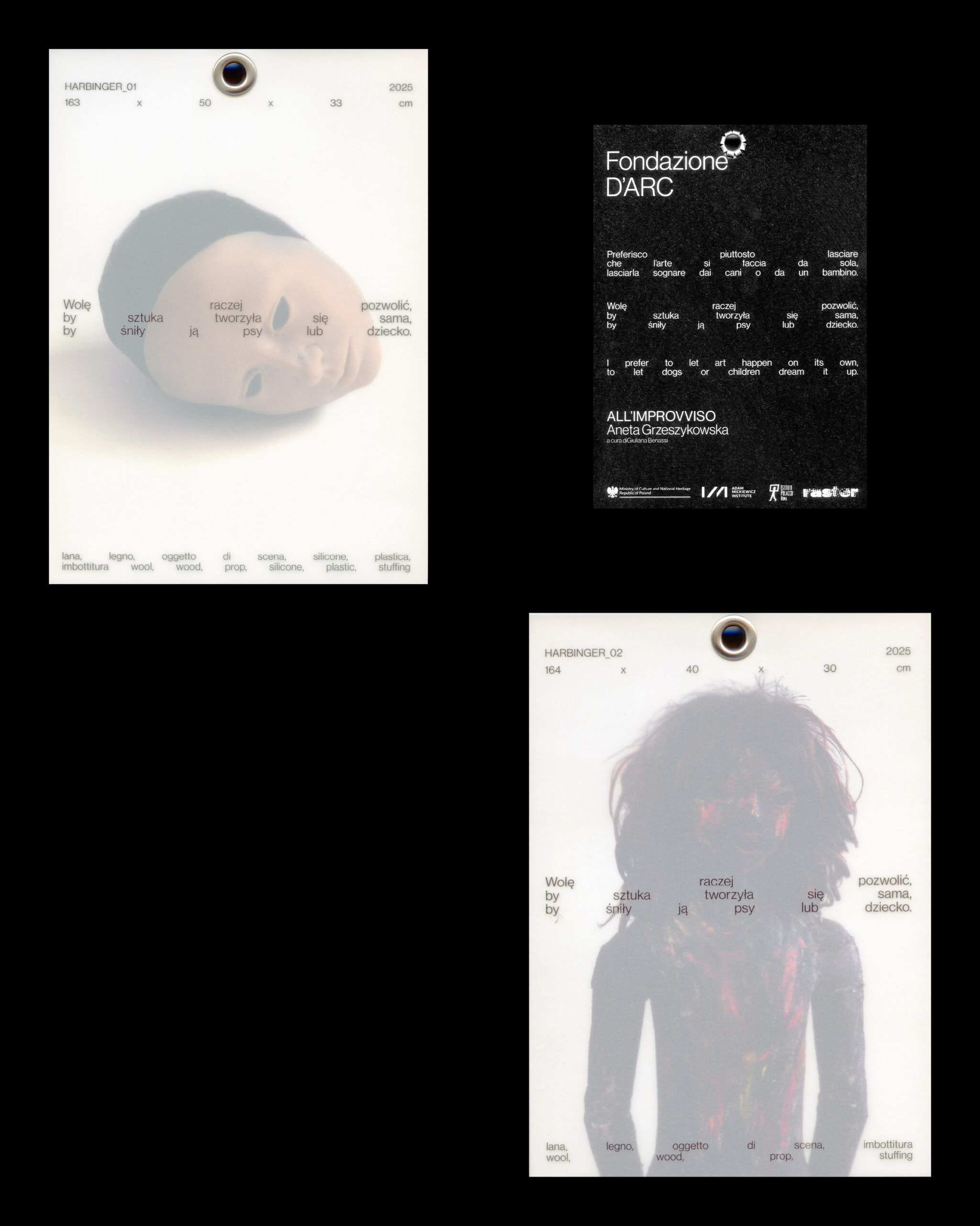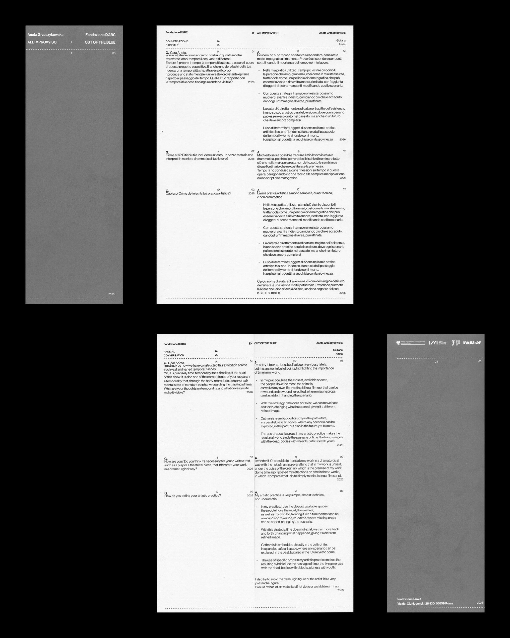 Il progetto grafico sviluppato per la mostra All’improvviso, prima personale in Italia di Aneta Grzeszykowska presso la Fondazione D’ARC, nasce come estensione concettuale dell’impianto curatoriale, traducendo in forma visiva e materica la riflessione sulla temporalità, sull’identità e sulla costruzione dell’immagine che attraversa l’intero percorso espositivo.